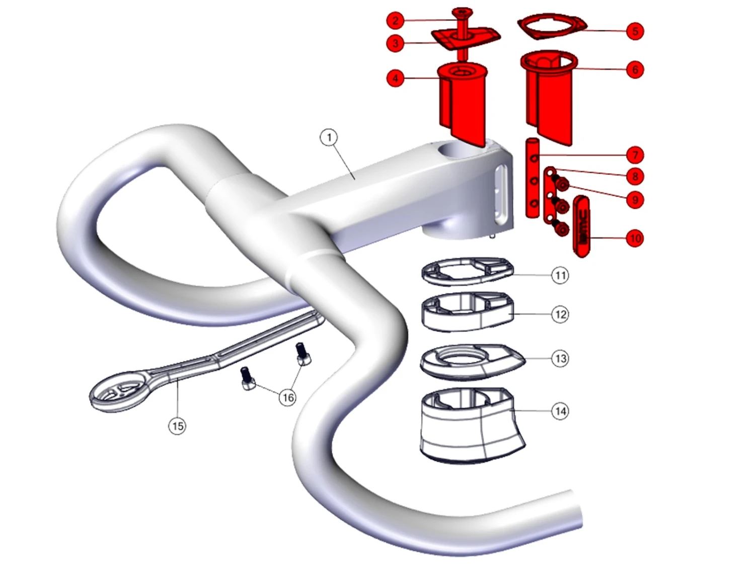 Le kit comprend tous les composants de serrage du pivot de fourche pour un cockpit ICS Carbon BMC avec capuchons.