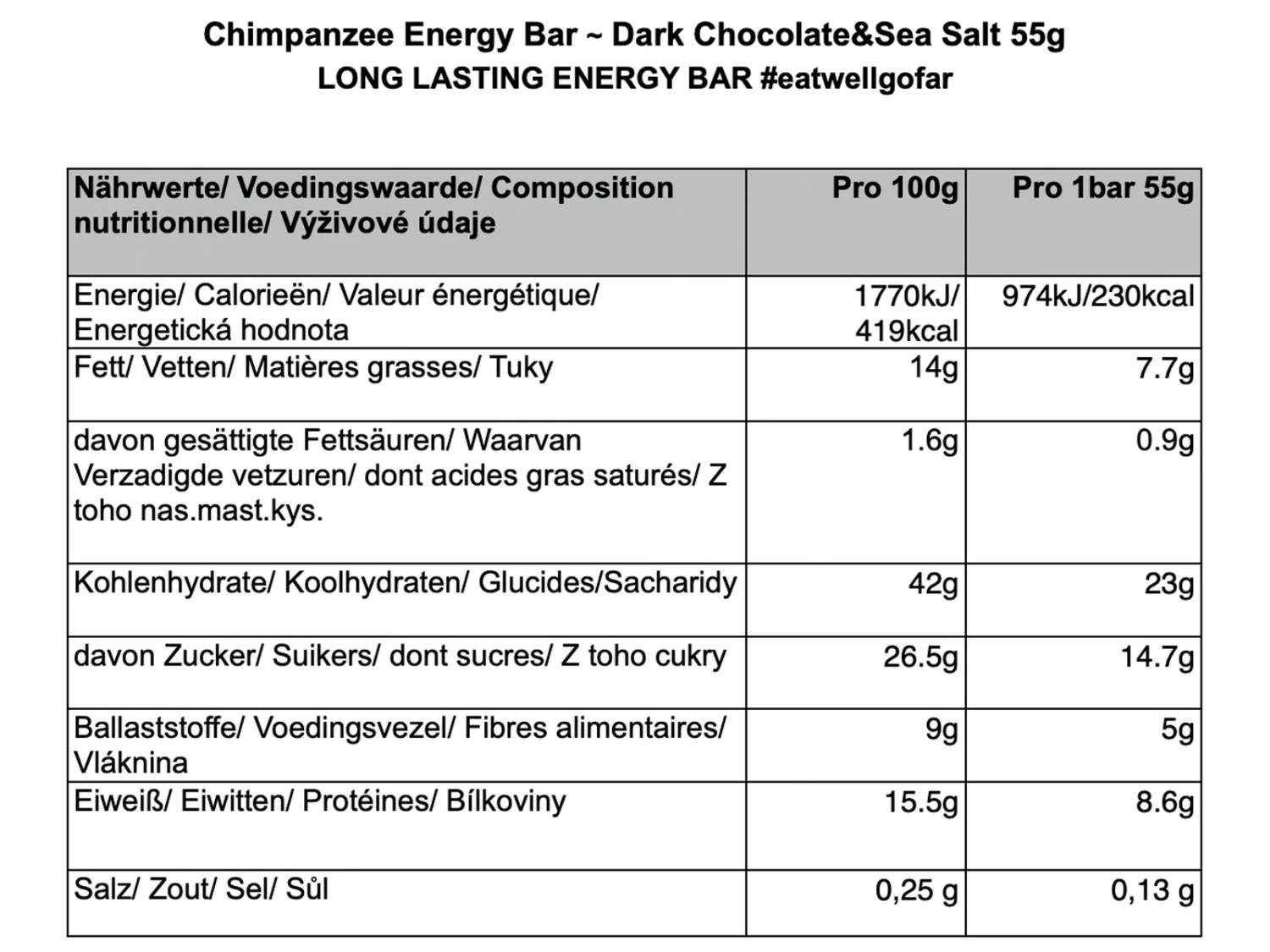 Délicieuse barre énergétique avec des morceaux de chocolat noir et de sel de mer. Contient 8,6 g de protéines. La barre énergétique Chimpanzee chocolat noir et sel marin contient une grande quantité de protéines et de fibres et est une excellente source d’énergie naturelle.